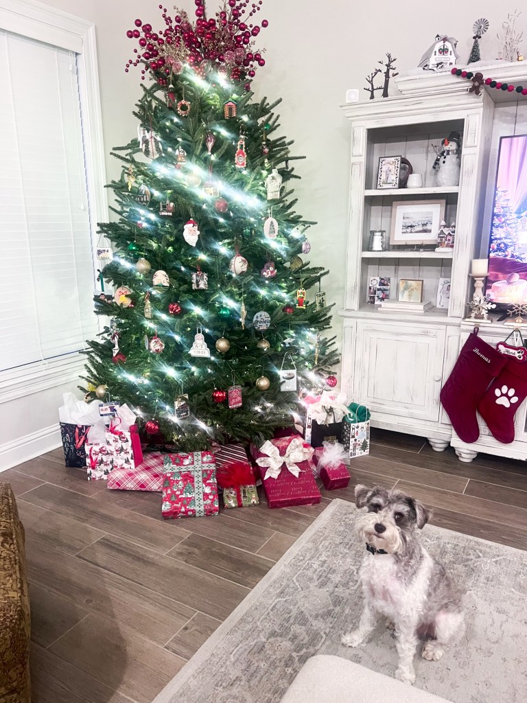 A timeless Christmas tree with classic decor and a dog curled up beneath it. A charming, nostalgic holiday scene.