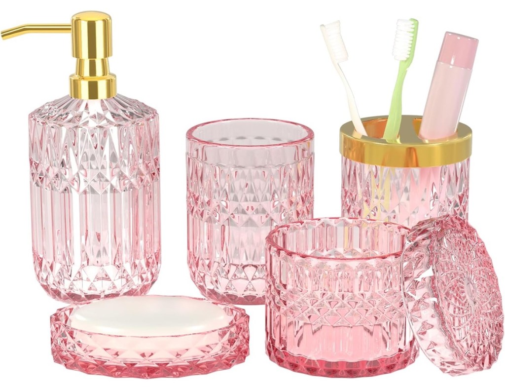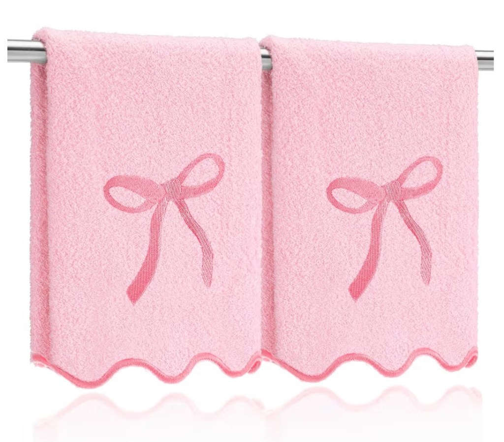 This girly bathroom makeover features soft pink tones, scalloped details, chic crystal-inspired accessories, feminine towels with bow accents, and playful wall art, creating a charming and stylish bathroom update. It’s perfect inspiration for anyone looking to design a pink bathroom, elevate their space with feminine decor, or add elegant yet fun touches to a vanity or powder room.