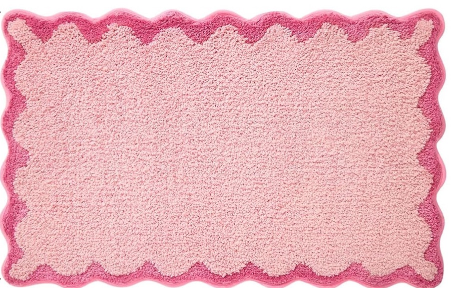 girly bathroom decor, pink bathroom ideas, feminine bathroom makeover, scalloped bathroom rug, pink vanity accessories, bow bathroom towels, bathroom styling inspiration, pink home decor, and chic bathroom design.
